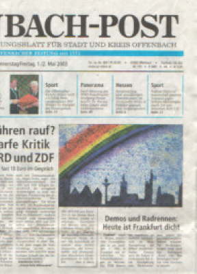 Die Frankfurter Skyline auf der Titelseite der Offenbach-Post - was haben die sich wohl dabei gedacht?1./ 2. Mai 2003